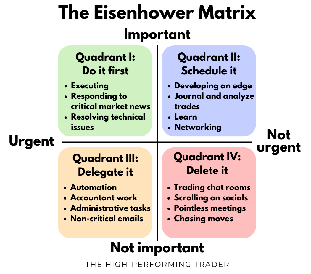 In trading, execution is urgent and important; journaling and analyzing your trades is important but not urgent, so the trader ends up skipping it and spending more time on the screens than necessary. You might want to delegate some tasks that are urgent but not important, like paperwork for your trading business.