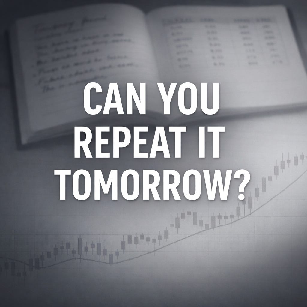 After your next green day, ask yourself a better question. Not “how much did I make?” but “can I repeat this tomorrow?”
