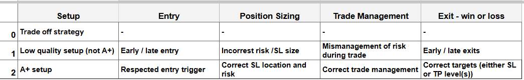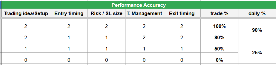 Note: If you rate the setup as a 0, the other parameters are automatically scored as 0. It's pointless to have a great entry or exit on a trade that shouldn't have been taken in the first place. This helps you reframe success around your process, not the outcome.